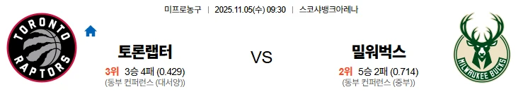 이번 경기는 리바운드 우위가 경기의 심리적 균형을 결정할 흐름이다. 토론토는 퀴클리와 바렛이 하프코트 세트에서 템포를 조절하겠지만, 리바운드 싸움에서 밀리면 공격 루틴이 끊길 것이다. 야콥 퍼들이 버텨주더라도 세컨드 찬스 허용이 늘어나는 순간 경기 주도권이 밀워키로 넘어간다. 반면 밀워키는 야니스와 터너의 피지컬 우위를 앞세워 골밑을 장악하고, 세컨드 찬스를 통해 공격 템포를 유지한다. 특히 야니스가 리바운드를 잡은 직후 전방으로 전개하는 속도는 리그 최고 수준이며, 이는 토론토 수비를 흔든다. 결국 밀워키는 리바운드 기반의 공격 구조로 슈터들에게 심리적 안정감을 주며, 과감한 슛 선택이 이어진다. 리바운드에서 만들어진 자신감이 전체 경기 리듬을 통제할 가능성이 높다. 토론토가 홈의 에너지를 앞세워도 골밑에서 버티기 어렵고, 후반으로 갈수록 격차가 벌어질 가능성이 크다.