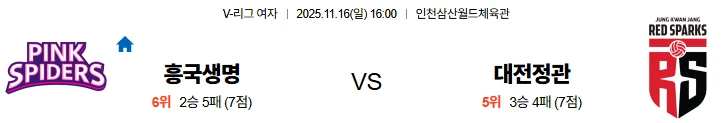 일곱번째경기는 흥국생명과 대전정관장입니다. 흥국생명은 인천 삼산 월드체육관에서 열릴 이번 홈경기에서 부상 여파로 전력 구성에 어려움을 겪고 있습니다. 세터 이고은의 결장으로 인해 세트 운영의 유연성이 떨어졌고, 미들 블로커 이다현의 부재 역시 중앙 블로킹의 안정감을 상당 부분 약화시켰습니다. 이러한 사정은 공격 전개보다는 수비 집중력 유지에 초점을 맞출 수밖에 없는 흐름으로 이어질 가능성이 높습니다. 공격에서는 레베카를 중심으로한 측면 위주의 득점 비중이 커질 것이며, 리시브와 디그를 통해 상대의 서브 공세를 버티면서 버티기 싸움으로 가져가는 전략이 예상됩니다. 세트 초반보다는 중반 이후 안정된 패턴으로 연결되는 점유 흐름이 강해, 긴 랠리와 철저한 리스크 관리형 플레이가 주를 이룰 것으로 보입니다. 대전정관장은 블로킹 효율과 서브 압박에서 여전히 리그 상위권 수준의 위력을 유지하고 있지만, 세터 염혜선의 부재로 인한 세트 배분의 일관성이 떨어지는 점이 약점으로 나타나고 있습니다. 백업 세터 김채나가 복귀할 예정이지만, 핵심 아시아쿼터 위파위는 복귀까지 좀 더 시간이 필요한 상황입니다. 또한, 주전 어포짓 자원의 결정력 응집도가 완벽히 복구되지 않아 랠리 후반부에서 확실히 점수를 가져오지 못하는 장면이 잦습니다. 공격형 구조로 경기를 풀어가지만, 흥국생명의 끈질긴 디그와 후위 수비를 뚫는 과정에서 효율이 감소할 가능성이 존재합니다. 이에 따라 블로킹 중심의 견고한 전위 운영으로 맞서겠지만, 득점보다는 수비 집중으로 흐름이 길어지는 구간이 많아질 것으로 보입니다. 결론을 말씀드리자면 결국 이번 경기는 양팀 모두 세트 운영에서 완전한 리듬을 찾기 어려운 구도로 진행될 전망입니다. 흥국생명은 부상 공백에도 불구하고 홈에서의 응집력과 수비 완성도로 상대의 공격 효율을 억제하려 할 것이며, 대전정관장은 안정적인 블로킹 라인을 유지하면서 최소 실점으로 세트를 운용하려 할 것입니다. 전체적으로 득점 교환이 많지 않고 랠리마다 길어진 전개로 인해 총점이 낮게 형성될 가능성이 높습니다.