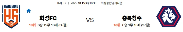 10월11일 16:30 화성FC 충북청주 K리그 스포츠분석,스포츠중계