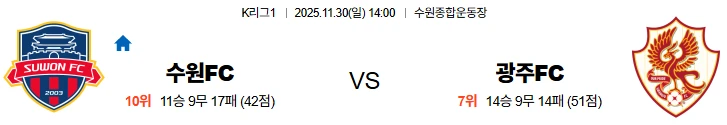 세번째경기는 수원FC와 광주FC입니다. 수원FC는 시즌 전체 33경기에서 10승 8무 15패를 기록하며 순위 중하위권에 머물러 있으나, 공격의 핵심인 싸박이 17골을 기록하며 리그 득점 선두에 올라 있는 점은 여전히 팀의 가장 큰 희망입니다. 다만, 최근 리그에서 보여준 흐름은 수비적인 불안정성이 뚜렷합니다. 33경기에서 53실점을 허용하며 경기당 평균 1.6실점으로, 수비진 불안이 고스란히 드러나고 있습니다. 김태한, 이지솔, 이현용이 꾸준히 출전하고 있지만 라인간 간격 조절과 미드필더 2선 압박의 연계가 부족해 후반부 체력 저하시 잦은 실점으로 이어지는 경향이 있습니다. 중원에서는 노경호가 활동량을 바탕으로 상대 압박에 대응하고 있으며, 이재원의 결승골 장면은 여전히 수원의 전방 전개가 살아 있음을 보여줍니다. 윌리안은 아직 출전 시간이 제한적이지만 10경기에서 8골 2도움을 기록하며 효율성을 입증했습니다. 한편, 벤치 코칭진에서는 김태민 코치가 징계로 빠지면서 경기중 세부 조율에서 손실이 불가피합니다. 전력상 결장 선수는 없지만, 잦은 경기 일정으로 선수단 피로 누적이 심각한 상태입니다. 12일간 3경기 일정으로 진행 중인 상황이어서 이번 경기에서도 후반 집중력 문제가 노출될 가능성이 큽니다. 공격력은 유지되지만, 수비 전환이 느린 구조적 한계가 반복되고 있다는 점이 불안 요인으로 작용합니다. 광주FC는 리그 중위권 위치를 안정적으로 지키며 리그 잔류를 이미 확정지은 상태에서 이번 원정 경기를 준비하고 있습니다. 최근 울산전에서 인상적인 경기력을 선보였고, 팀 내외 분위기도 긍정적입니다. 프리드욘손과 헤이스가 각각 9골씩 기록 중이며, 특히 프리드욘손은 최근 제주전과 울산전에서 연속 득점에 성공하며 공격 감각이 절정에 올랐습니다. 헤이스 역시 특유의 침투와 강한 피지컬을 기반으로 상대 수비를 끊임없이 흔들며 팀 공격의 축을 담당합니다. 최경록은 울산전에서 시즌 첫골을 터뜨리며 2선 자원으로서의 입지를 다시 굳혔습니다. 중원에서는 주세종과 신창무, 오후성이 안정적으로 연결고리를 형성하고 있고, 변준수와 조성권, 신상민이 이끄는 수비 라인은 최근 4경기 1실점이라는 압도적인 안정감을 과시하고 있습니다. 부상 결장자는 공식 명단에서 확인되지 않았으며, 이는 전력 유지에 큰 도움이 되고 있습니다. 다만, 팀은 코리아컵 결승전을 앞두고 있어 일부 로테이션 가능성이 남아 있으나, 감독과 선수단 전반이 기세 유지를 중시하고 있어 핵심 전력 대부분이 이번 경기에 나설 가능성이 높습니다. 체력적 여유가 수원보다 크다는 점에서 경기 후반 주도권에서도 우위를 점할 것으로 전망됩니다. 결론을 말씀드리자면 여러 전력을 종합하면 프리드욘손과 헤이스가 중심이된 광주의 효율적인 공격과 안정된 수비 밸런스가 빛을 발할 가능성이 높으며, 수원의 수비 불안과 체력 누적이 맞물리며 결과는 원정 팀의 우세로 기울 것 같습니다. 광주FC의 승리와 오버를 추천드리는 경기입니다.