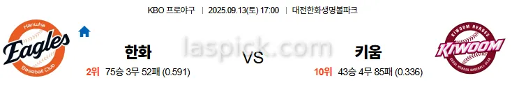 9월13일 17:00 한화 키움 국내야구 스포츠분석 축알못 토토사이트