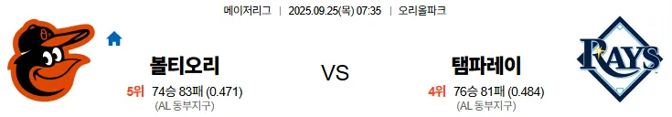 9월25일 07:35 볼티모어 탬파베이 MLB 스포츠분석 스포츠중계 토토사이트