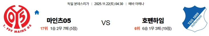 마인츠와 호펜하임입니다. 마인츠는 전방 압박과 빠른 전환을 동시에 노리는 팀입니다. 흘러바흐는 등지는 동작으로 볼을 지키면서 뒷공간 침투를 시도하고, 시브는 측면에서 하프스페이스로 파고들며 컷백 기회를 만듭니다. 이재성은 2선에서 짧은 패스와 원터치로 공격 템포를 조율하지만, 수비 라인에서 중원으로 넘어가는 첫 패스가 끊기거나 탈압박 실패시 사이드에서 볼을 쉽게 잃는 약점이 있습니다. 더블 볼란치가 세컨드볼 싸움에서 밀리면 박스앞 공간이 벌어지고, 후반 윙백의 왕복이 늘어나면서 라인 간격이 벌어져 측면과 하프스페이스 틈이 발생합니다. 결국 순간적 공격력은 있으나 중원 압박과 세컨드볼 관리에서 불안 요소가 존재하는 팀입니다. 호펜하임은 중원을 촘촘히 유지하며 탈압박 한번으로 흐름을 바꾸는 팀입니다. 렘펄은 측면과 중앙을 오가며 수비를 끌어내고 하프스페이스를 열어주고, 아슬라니는 압박을 받아도 첫 터치와 방향 전환으로 탈압박을 성공시키며 중원과 수비를 동시에 흔듭니다. 아브둘라후는 폭넓은 수비 커버와 세컨드볼 선취 능력을 갖춰 중원과 측면 균형을 유지합니다. 이 구조로 볼 확보 후 측면 전환과 1대1 돌파, 크로스를 활용해 박스 근처에서 공격 시간을 늘릴 수 있고, 공을 잃어도 역압박으로 세컨드볼을 재회수하며 경기 흐름을 장악할 수 있습니다. 탈압박이 터지는 순간 상대 쓰리백 뒷공간을 겨냥할 가능성이 높습니다. 결론을 말씀드리자면 이 경기는 중원 세컨드볼 장악과 탈압박 전환 안정성이 승부의 핵심입니다. 홈팀 마인츠는 쓰리백 특성상 전방 숫자는 충분하지만, 수비 라인과 중원 간격이 벌어지는 순간 컷백과 세컨드 슈팅에 취약합니다. 반면, 호펜하임은 중원 안정성이 높아, 첫 경합에서 밀려도 세컨드볼 회수로 점유를 끌어올릴 수 있습니다. 아슬라니가 탈압박에 성공하면 측면과 하프스페이스로 공을 연결하고, 아브둘라후가 뒤에서 균형을 잡아 커버 범위를 넓히며 다시 중원을 장악합니다. 시간이 흐를수록 마인츠는 선택지가 줄고 롱볼 비중이 늘어 세컨드볼 싸움에서 호펜하임에 주도권을 내줄 가능성이 큽니다. 초반 홈 이점을 활용한 압박은 있겠지만, 경기 흐름은 후반으로 갈수록 호펜하임 쪽으로 기울 전망입니다.