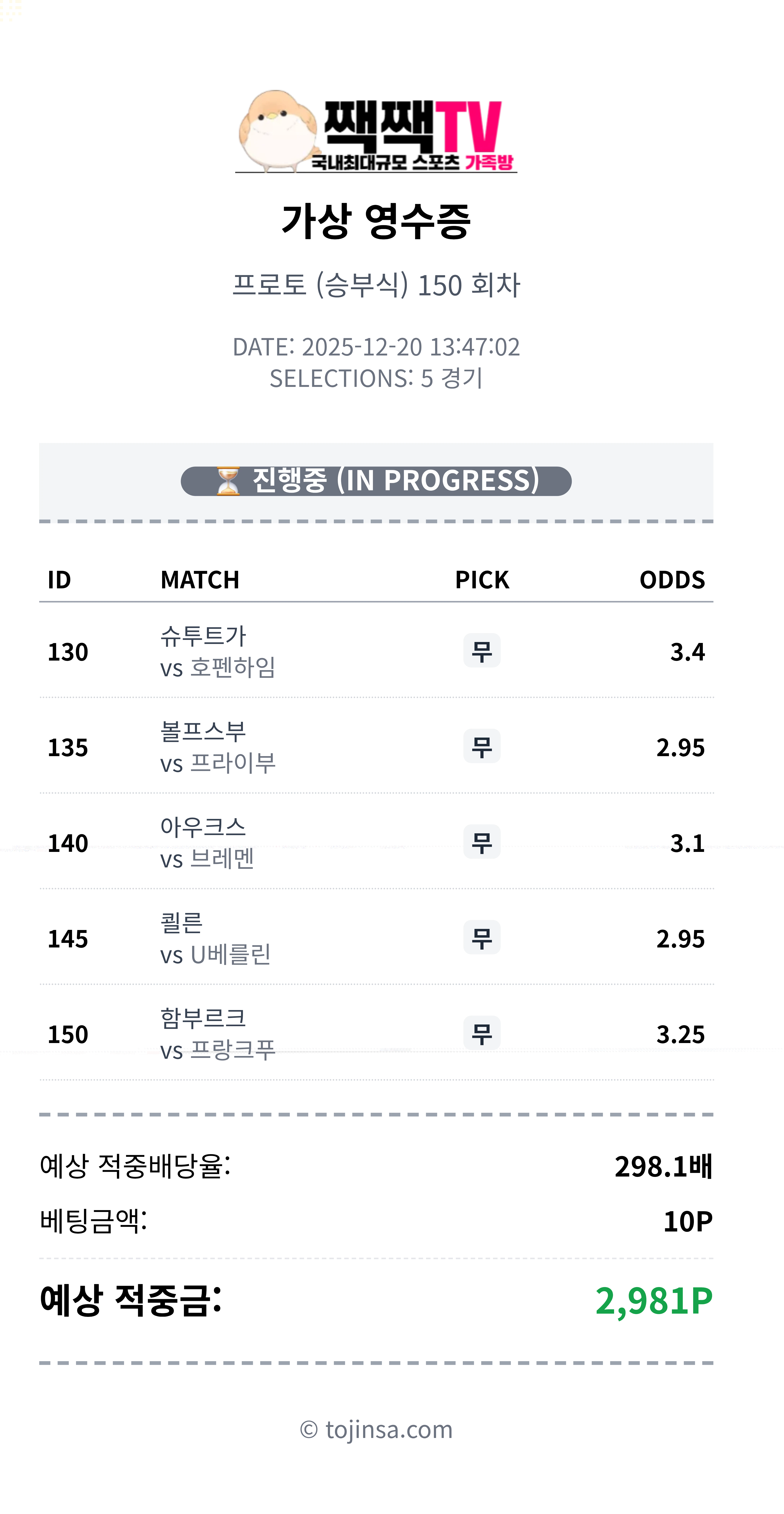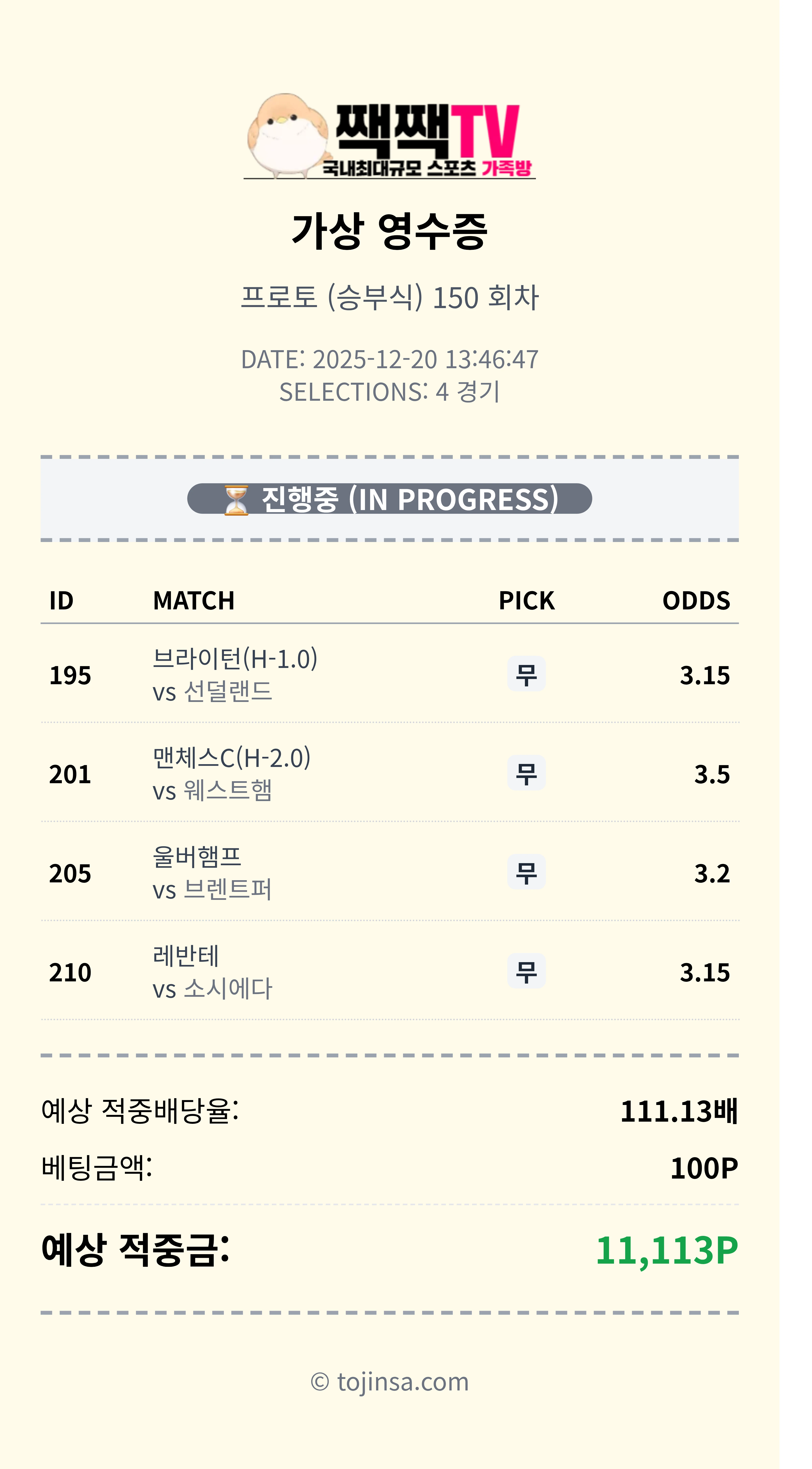 짹짹티비 스포츠중계에서는 회원분들께서 자유롭게 스포츠분석 추천픽을 공유해주지만, 100% 정답은 아닙니다. 추천픽을 참고로 자신만의 픽을 조합해서 공유해보세요 !